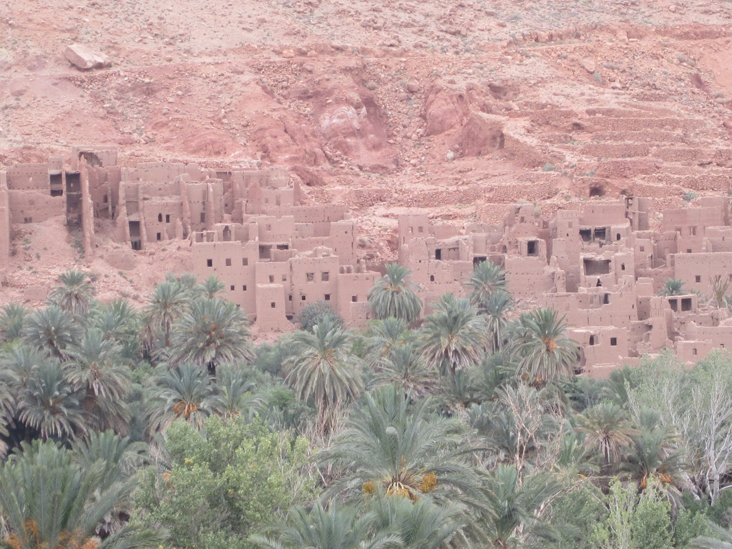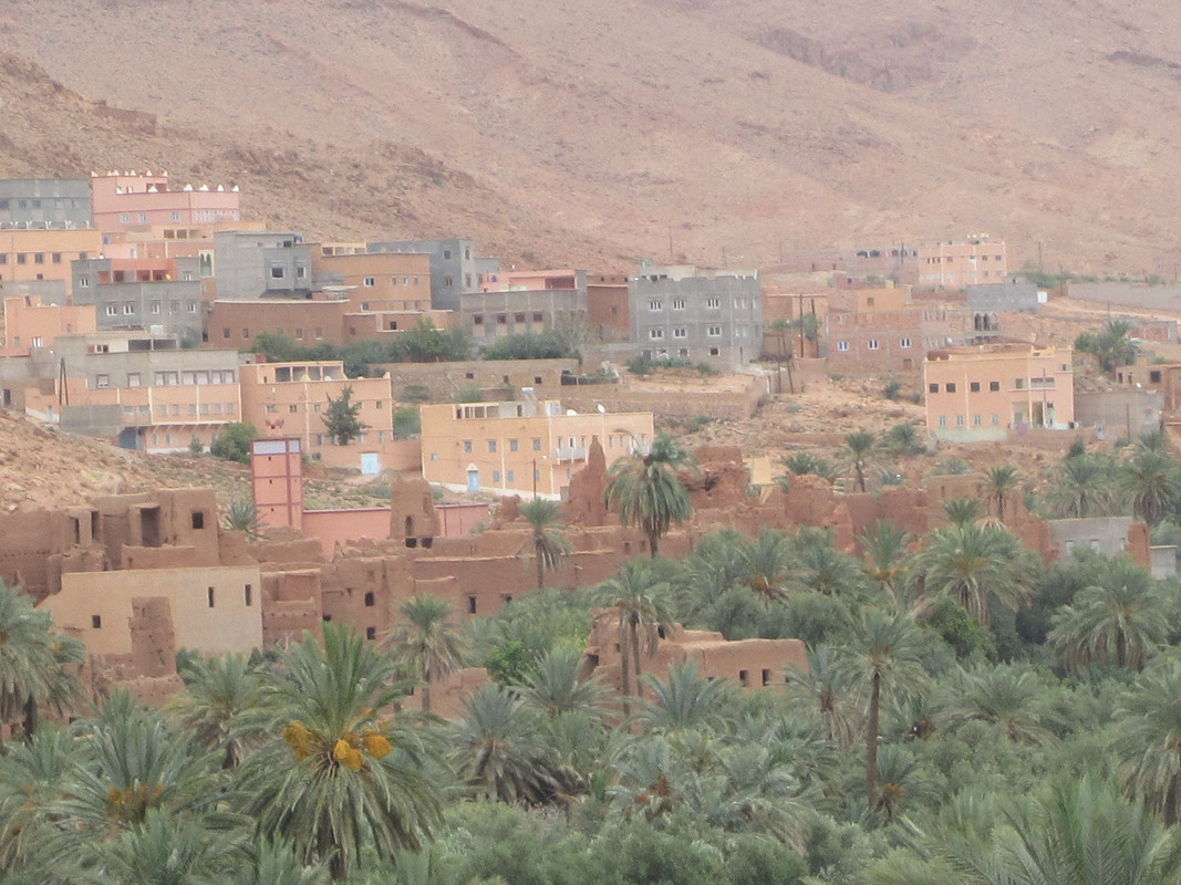 An old rural town adjacent to a lower community garden oasis. With no utilities of any sort. The government eventually built a very nearby replacement town at the other end of the oasis and moved everyone over leaving the older town abandoned. Wow, what an improvement. Even some satellite TV antennae in there. Morocco is a kingdom by rule. The population is very happy with and very proud of their King Mohammed VI. He has promoted many reforms and modernizations.